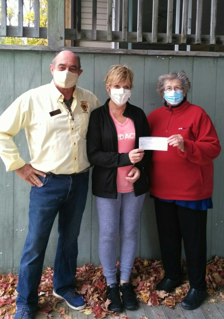 President Jim Scala and Lion Dorothy Maynard, chairperson of $10,000 draw, present Sherri Barr with her share of the grand prize.