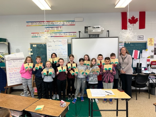 Rideau Vista students are holding their Easter “Pi Poem” cards they created to share with their senior pen pals. These cards contain poems based on 3.14159. Each “Pi” poem is constructed with the following sequence: three words, one word, four words, one word, five words and nine words.