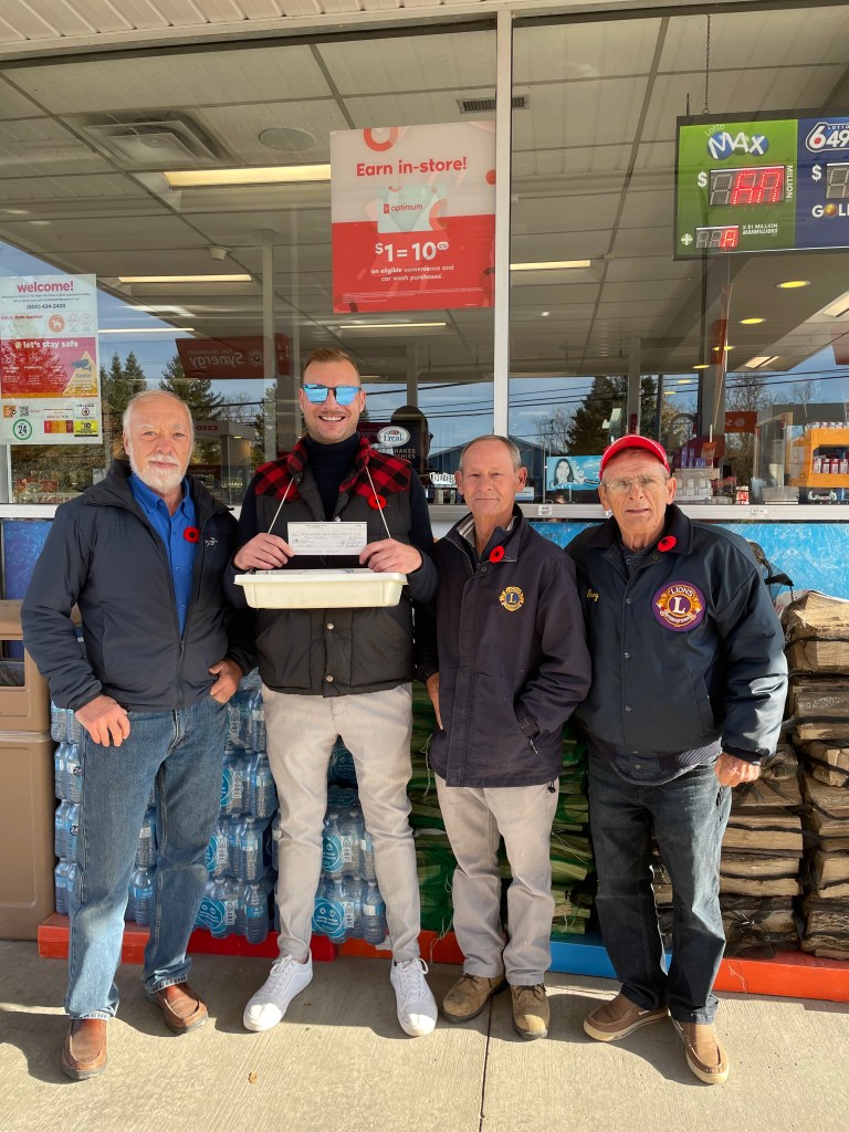 Ed Grunig, second from the left, accepts a cheque from Lions Peter Minnelli, Marty Hawkins, and Gary Warriner towards the Legion’s poppy drive.