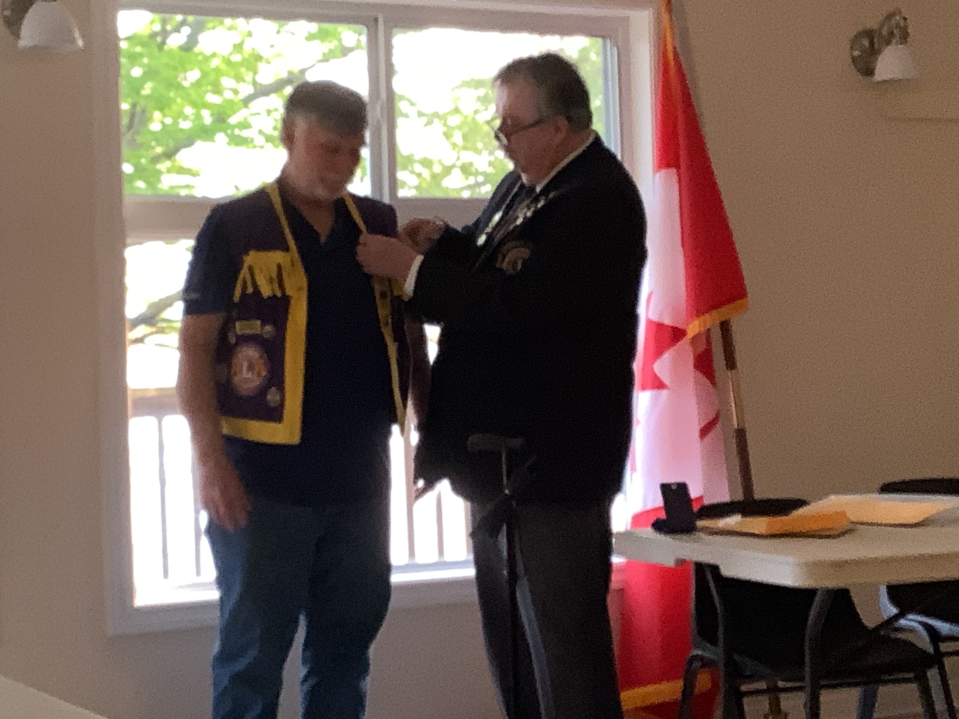Lion Marty Hawkins (left) receives his 30-years service chevron from Past District Governor Jean Lauziere.