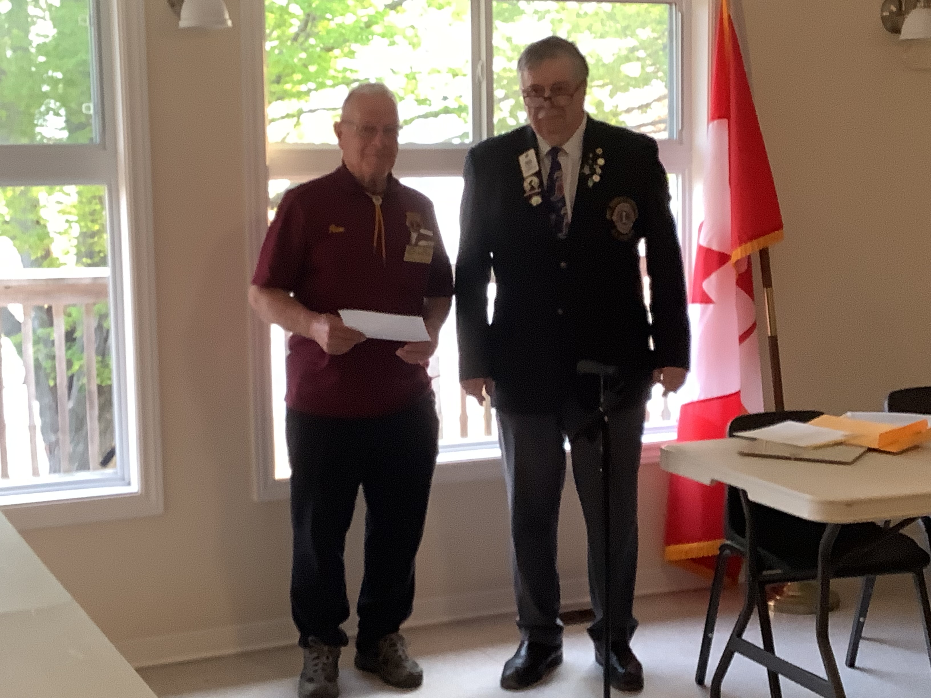 Lion Wayne Bent received the International Leadership Award from Past International President Dr. Jung-Yul Chois for his distinguished leadership over the years. Wayne traditionally would have received this prestigious award at the A-4 District convention in 2021. The convention was cancelled because of Covid, so Past District Governor Jean Lauziere presented it to Wayne at the club’s meeting. This award is the third highest given out by Lions International, Melvin Jones is second, and The Lions Humanitarian Award is the top award.