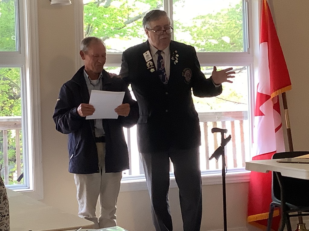 Lion Jim McGlade (left) receives his 50-years service chevron from Past District Governor Jean Lauziere.