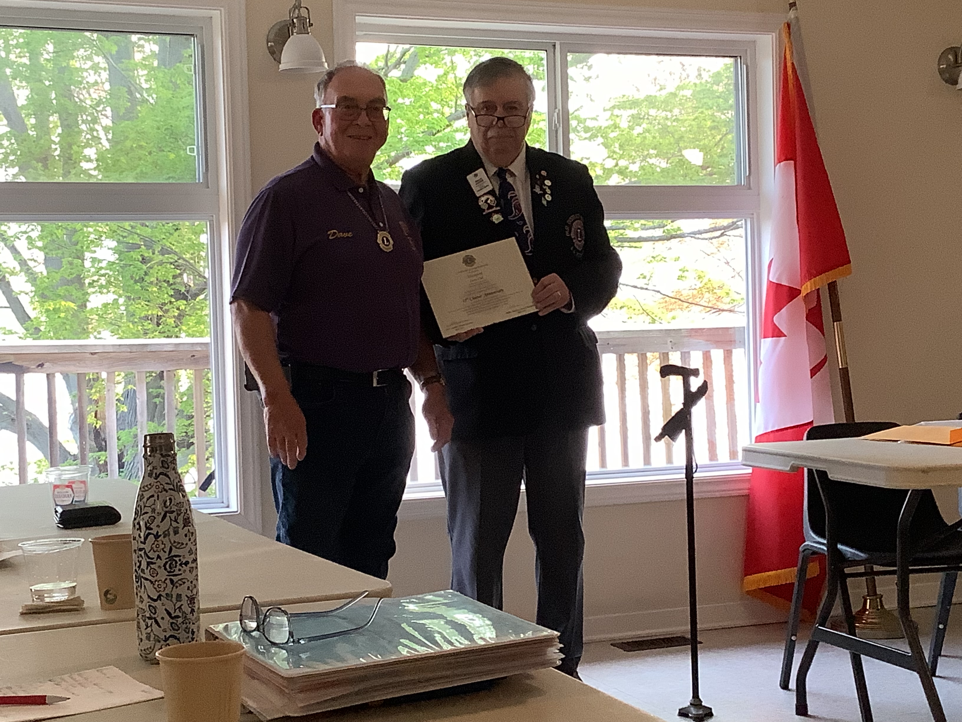 Lion Dave Blair (left) accepts the club’s 75-year charter certificate from Past Governor Jean Lauziere.