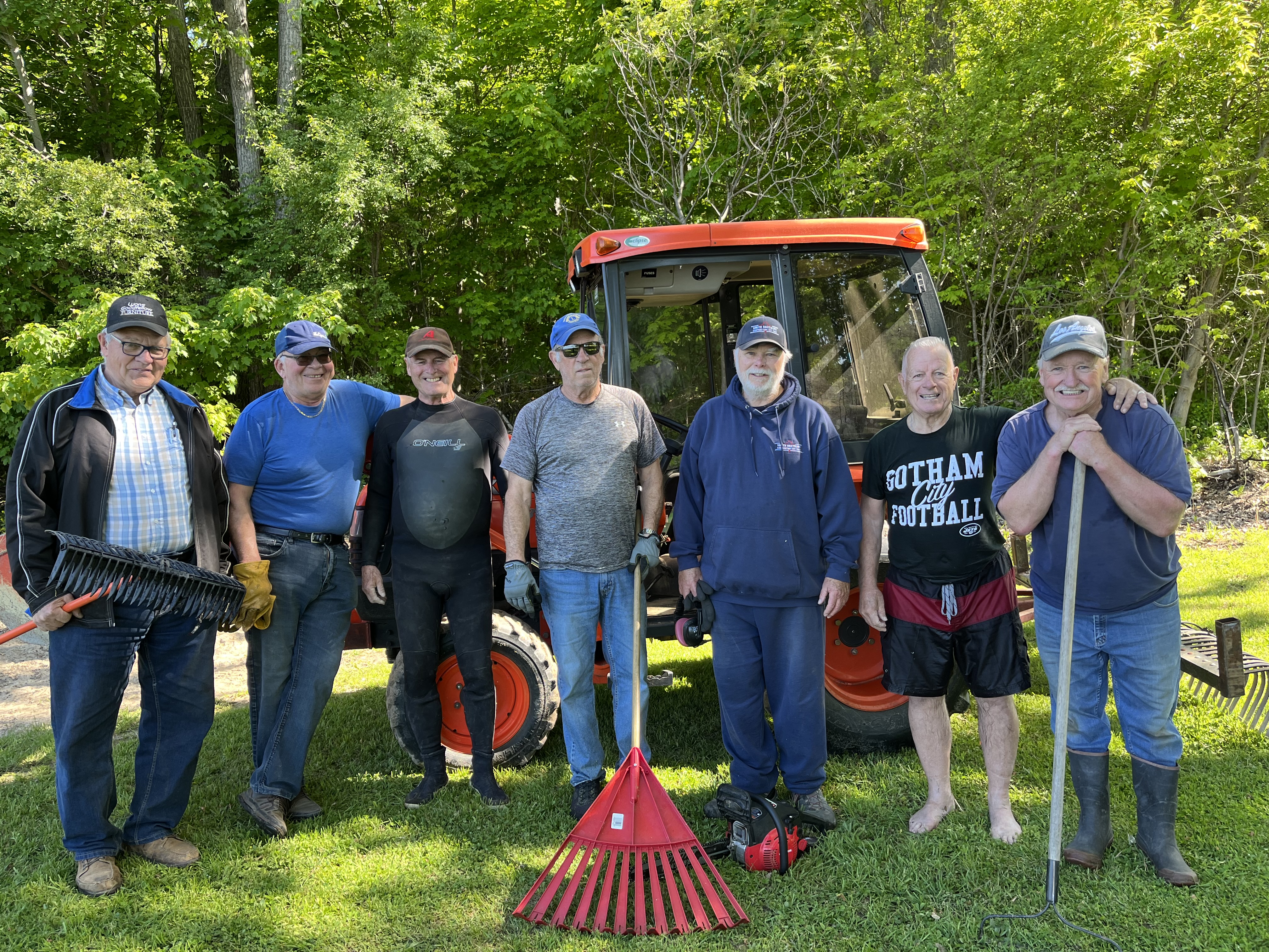 On Saturday, May 27, a crew of Lions between 69 and 80 years of age worked straight from 9:00 a.m. until 1:30 p.m. putting in the swimming buoys and cleaning the beach.