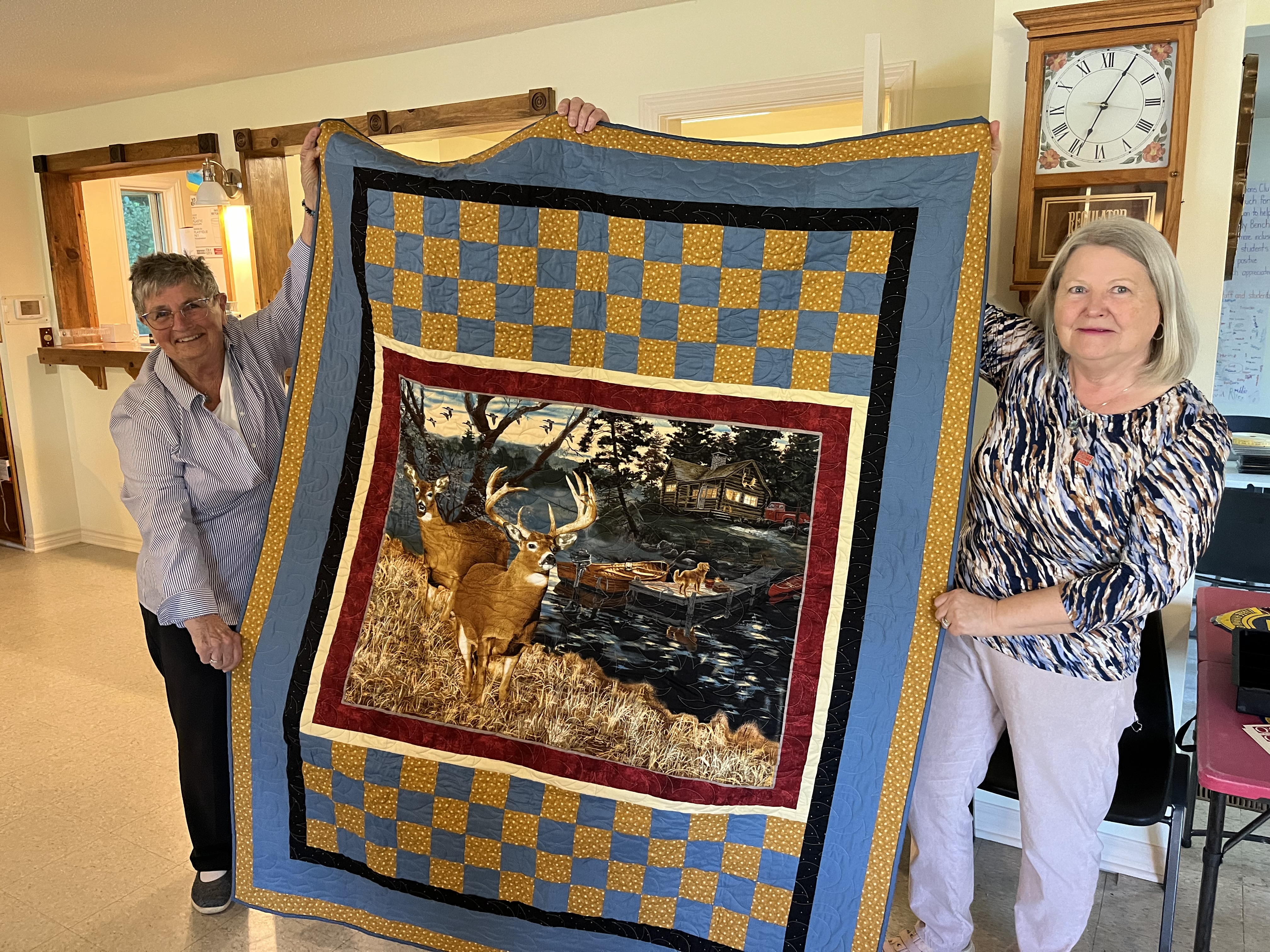 Judy Pattinson (left) and Marilyn Lockyer from Quilts of Valour display a quilt that will be given to an ill or injured Canadian Armed Forces member.