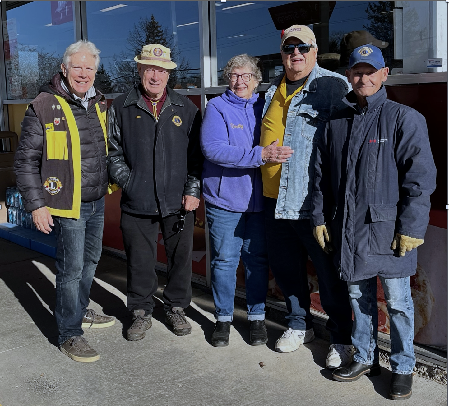 From the left, Lions Bob Reddick, Jim McGlade, Dorothy Maynard, Rick Warriner and Marty Hawkins participated in Lions Diabetes Tag Day. Missing from the photo are Lion David Lowery and volunteer Johnny Norwood.