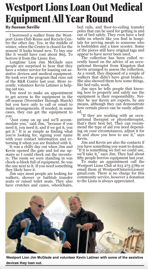 Super writeup. Jim and Kevin, you are to be heartily commended for continuing our Lions’ medical equipment pool out of the R&R Centre