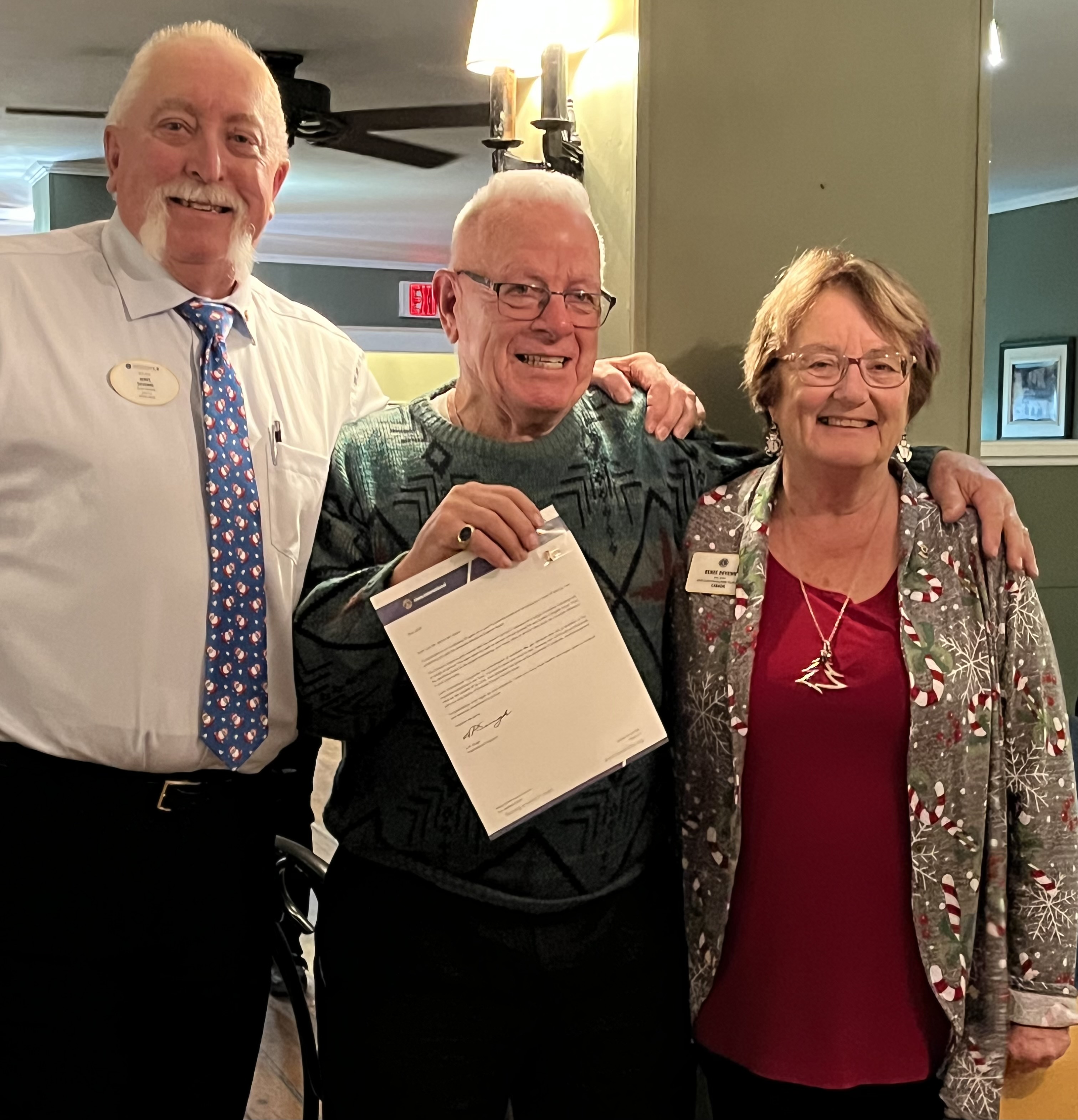 Lion Jim McGlade receives his 55-year chevron from District Governor Jim Devenny, left, and past Governor Renee Devenny, right. Photo credit: Pat Reddick