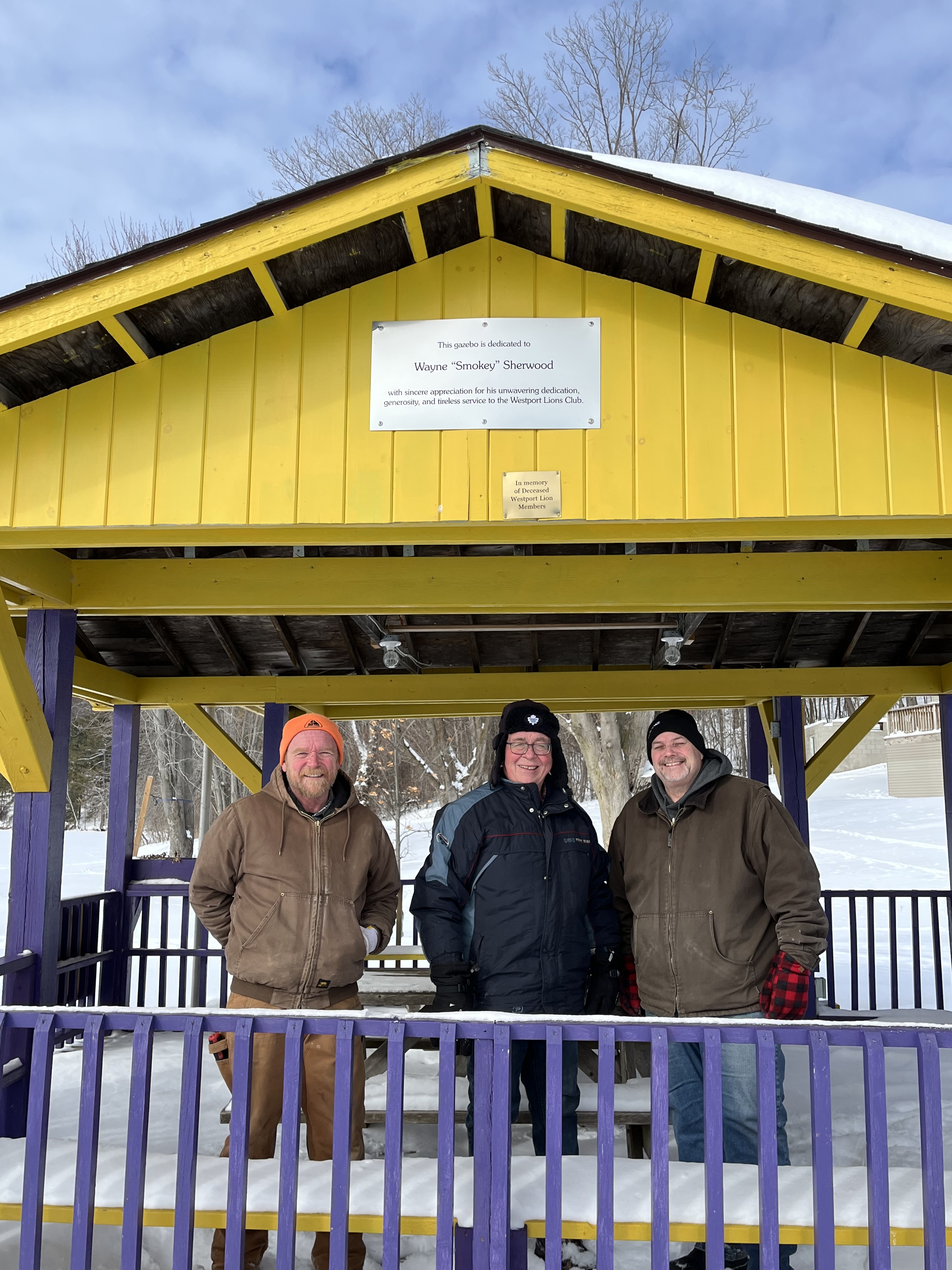 The snow was so deep that Lion David Blair first had to clear a path so Bruce and Craig could reach the gazebo to install the plaque. The plaque reads: This gazebo is dedicated to Wayne “Smokey” Sherwood with sincere appreciation for his unwavering dedication, generosity, and tireless service to the Westport Lions Club. Specifically, Smokey has spent countless hours painting the gazebo, remodelling, painting the beach washrooms, installing a donation box and signs, and closing in part of the area below the balcony.