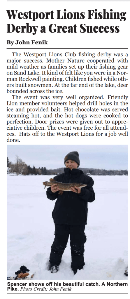 Westport Lions Fishing Derby a Great Success Posted on February 19, 2026 by breddick Share this: Share on X (Opens in new window) X Share on Facebook (Opens in new window) Facebook Like Loading... Related